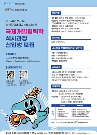 경상국립대 국제개발협력학 석사과정 지원자격은 학사학위취득(예정)자 또는 이와 동등한 자격이 있다고 인정되는 사람으로 학사학위과정의 출신과 전공에 관계없이 지원할 수 있다. 원서접수는 17일까지며 상세 내용은 경상국립대 행정대학원 누리집에서 확인하면 된다.