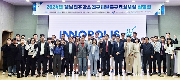 경남진주강소특구지원센터와 진주시는 지난 8일 경상국립대 항공우주산학협력관(407동) 대강당에서 공동연구개발기관 관계자, 강소특구 내 기업체 임직원과 예비창업자 등 70여 명이 참석한 가운데 ‘2024년 경남진주강소연구개발특구 육성사업 설명회’를 온·오프라인으로 동시에 개최했다고 10일 밝혔다.