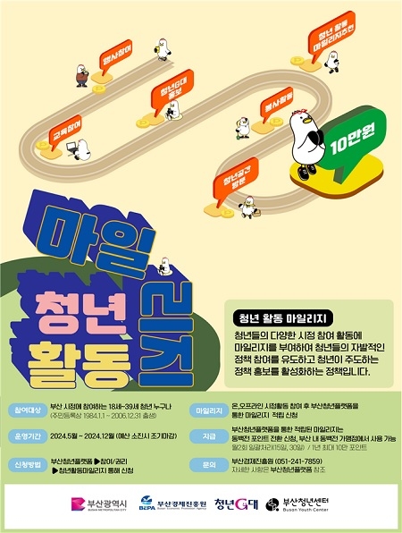 부산시가 청년들의 자발적인 정책 참여를 유도하고 청년이 주도하는 정책 홍보를 활성화하기 위해 '청년 활동 마일리지 제도'를 운영한다고 밝혔다.