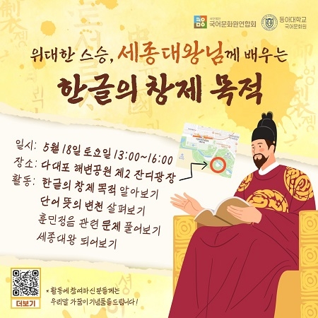 문화체육관광부가 후원하고 동아대 국어문화원, 부산 우리말 가꿈이가 주관하는 이번 행사는 부산 시민 대상으로 오는 18일 오후 1시부터 4시까지 부산 다대포 해변공원 제2잔디광장(잔디광장2)에서 열린다.