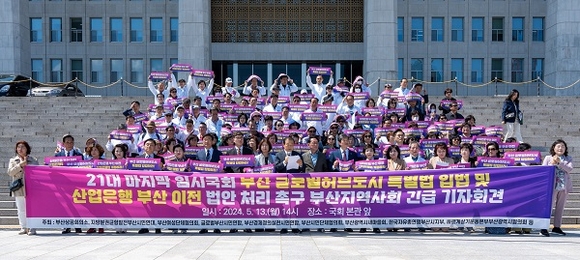 각계 대표들은 기자회견문에서 “수도권 초집중, 저출생과 고령화, 지방소멸의 국가적 위기 경보가 끊임없이 울리고 있는 현 상황에서 부산글로벌허브도시 특별법과 산업은행 부산이전은 대한민국의 지속가능한 발전 토대를 구축하는 핵심과제”라며 “21대 국회의 임기가 오는 29일로 종료되는 만큼 여․야가 합심해 유종의 미를 거둬야 한다”고 강조했다.