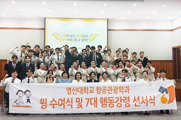 영산대학교는 항공관광학과가 지난 8일 해운대캠퍼스 CCC홀에서 항공관광산업 글로벌 리더로의 성장을 다짐하는 ‘제6회 윙(wing) 수여식’을 진행했다고 17일 밝혔다.