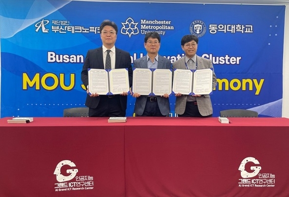부산테크노파크 지역혁신융복합단지추진단이 20일 영국 맨체스터 메트로폴리탄 대학교 Creative AR & VR Hub, 동의대학교 인공지능그랜드ICT연구센터와 다자간 업무협약을 체결했다고 밝혔다.