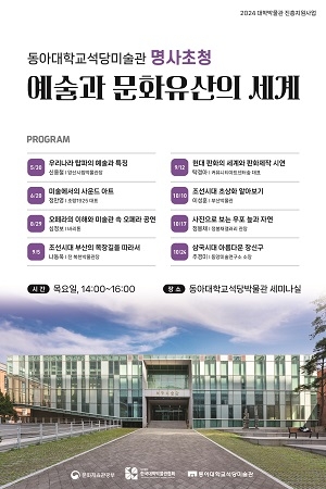 동아대학교 석당미술관은 2024년 대학박물관진흥지원 사업의 하나로 ‘명사초청: 예술과 문화유산의 세계’ 강연을 오는 30일을 시작으로 10월까지 진행한다고 24일 밝혔다.