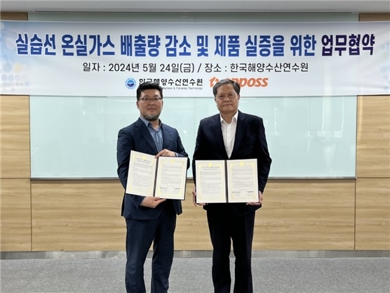 한국해양수산연수원이 지난 24일 부산본원 대회의실에서 온실가스 배출량 감소를 실현하고 국산 혁신제품 성능실증을 위해 이엔포스와 업무협약을 체결했다고 밝혔다.