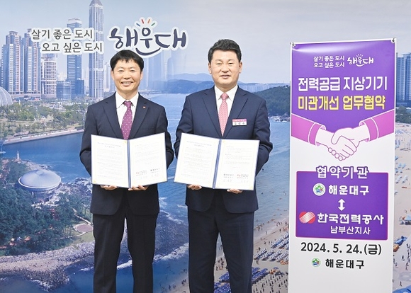 한전 남부산지사는 지난 24일 해운대구청과 함께 상호 긴밀한 업무협조 체제를 구축해 ‘살기 좋은 도시, 오고 싶은 도시 해운대’를 함께 만들고자 ‘지역내 핵심 관광지구 전력공급 지상기기 미관개선’을 위한 업무협약을 체결했다고 27일 밝혔다.