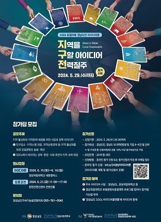 경상국립대학교 로컬콘텐츠중점대학사업단은 경남도지속가능발전협의회와 오는 6월 15일과 16일 2일간 경상국립대 내동캠퍼스 1층 울림관에서 ‘2024 로컬미래 경남도민 아이디어톤’을 공동으로 개최한다고 27일 밝혔다. 이번 행사에 참가한 팀을 대상으로 6월 21 창원 컨벤션센터에서 최종 경연을 통해 우수팀을 시상할 계획이다.
