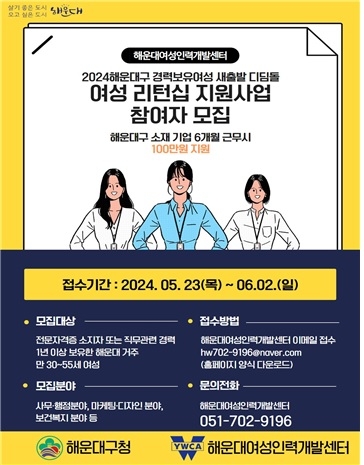 부산 해운대구가 임신, 출산, 육아, 가족돌봄 등의 이유로 경력이 단절된 여성들에게 근무 경험 기회를 제공하는 ‘여성 리턴십 사업’을 시행한다고 밝혔다.