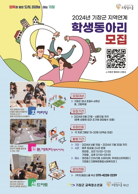 ‘2024년 지역연계 학생동아리’는 또래 친구들과 함께 문화·예술·체육 활동을 체험하면서 협동심과 체력, 예술적 감성과 소양을 함양할 수 있는 프로그램이다. 기장군 주최와 드림잡스쿨부산 주관으로 6월 15일부터 11월 30일까지 매주 토요일마다 총 25회로 진행된다.