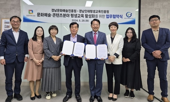 경남문화예술진흥원(진흥원)과 경남도인재평생교육진흥원(교육진흥원)이 28일 경남연구원에서 업무협약을 체결했다고 밝혔다. 협약식에는 진흥원 김종부 원장, 교육진흥원 유원석 원장을 비롯한 양 기관 관계자 10명이 참석했다.