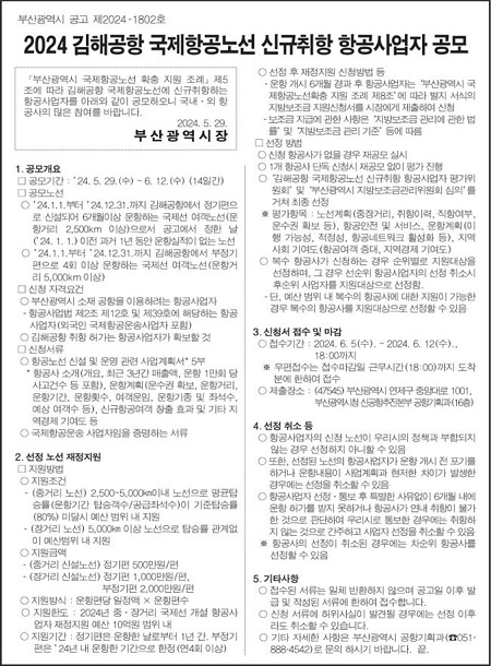 공모 대상은 2024년 1월 1일 기준 과거 1년간 김해공항 미취항 노선 중, 취항일부터 6개월 이상 연속 운항하는 중·장거리 정기 여객노선과 연 4회 이상 운항하는 장거리 부정기 여객노선이다.