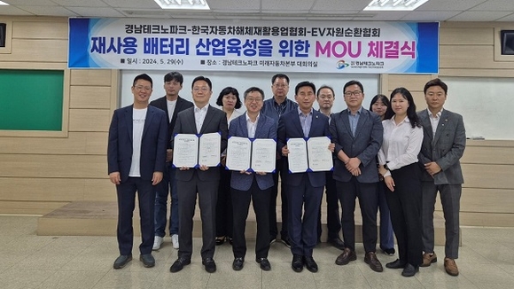 경남테크노파크(경남TP)는 29일 경남TP 미래자동차본부 대회의실에서 재사용 배터리 산업육성을 위해 한국자동차해체재활용업협회(한해협), EV자원순환협회(EV협회)와 업무협약을 체결했다고 밝혔다.