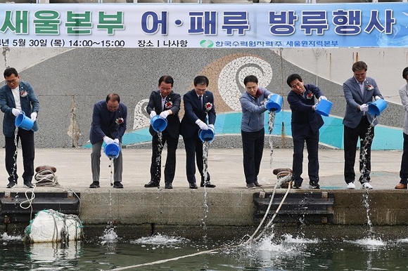 한국수력원자력 새울원자력본부는 30일 울주군 서생면 나사항과 인근 연안에서 ‘제8회 새울본부 어패류 방류 행사’를 열고 원자력발전소에서 나오는 온배수를 이용해 양식한 강도다리 치어와 전복 치패 등 총 19만 미를 방류했다고 밝혔다.