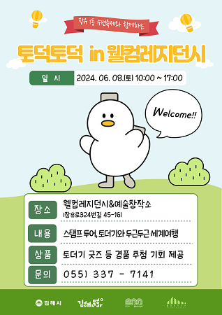 김해문화재단 웰컴레지던시가 오는 6월 8일에 열리는 ‘장유1동 수변축제’와 연계, 지역민과 함께하는 예술체험행사 ‘토덕토덕 in 웰컴레지던시’를 웰컴레지던시&예술창작소 일대에서 개최한다고 31일 밝혔다.