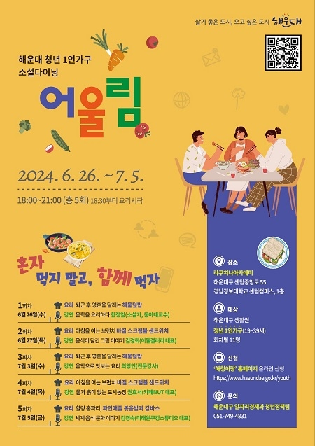 부산 해운대구가 청년 1인 가구의 건강한 식생활을 돕고, 다양한 주제의 인문학 강연을 통해 청년들의 일상에 활력을 불어넣는 ‘소셜 다이닝-어울림’을 운영한다고 밝혔다.