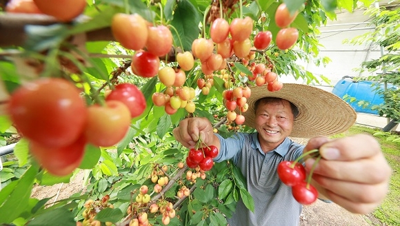 3일 남덕유산 자락인 경남 함양군 서상면 대로마을 체리하우스농장에서 서우식씨가 잘 익은 체리를 첫 수확하고 있다. 함양산 체리는 비타민C와 피로회복, 불면증개선, 통증완화, 노화억제, 피부미용 등에 효능이 있는 것으로 알려져 있다. (사진=함양군 제공)