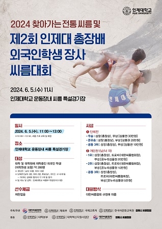 인제대학교는 오는 5일 오전 11시부터 오후 1시까지 ‘제2회 인제대 총장배 외국인학생 장사 씨름대회’를 개최한다고 밝혔다.