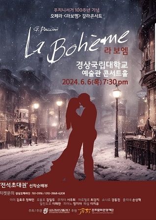 경상국립대학교는 푸치니 서거 100주년 기념 오페라 ‘라 보엠(La Bohème)’이 오는 6일 오후 7시 30분 경상국립대 예술관 콘서트홀에서 공연된다고 밝혔다.