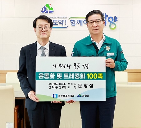 경남 함양군은 지난 3일 부산상공회의소에서 고향사랑 물품기부 행사로 마련된 운동화와 등산화 100켤레를 이웃돕기 성품으로 기탁했다고 밝혔다.