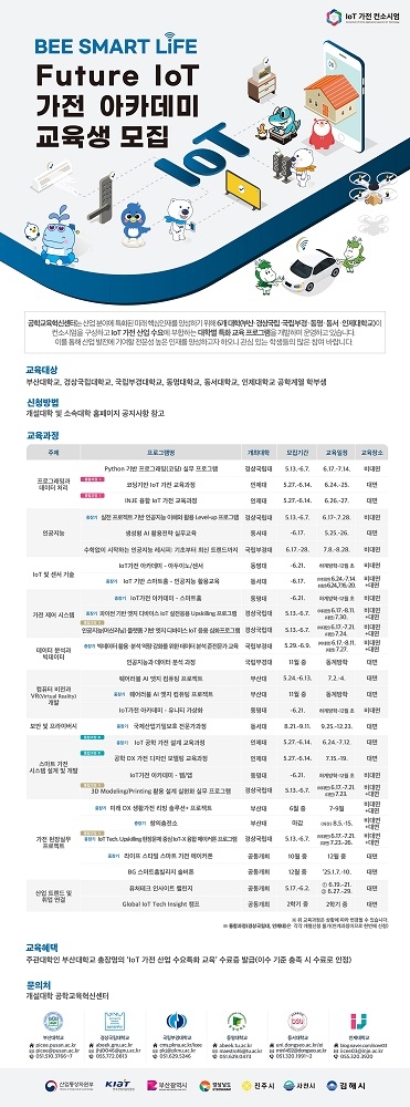 부산대학교 공학교육혁신센터는 IoT(사물인터넷) 가전산업 분야 컨소시엄을 이룬 동남권 5개 대학과 함께 ‘BEE Smart Life! Future IoT 가전 아카데미’를 개설하고 교육생을 모집한다고 5일 밝혔다.