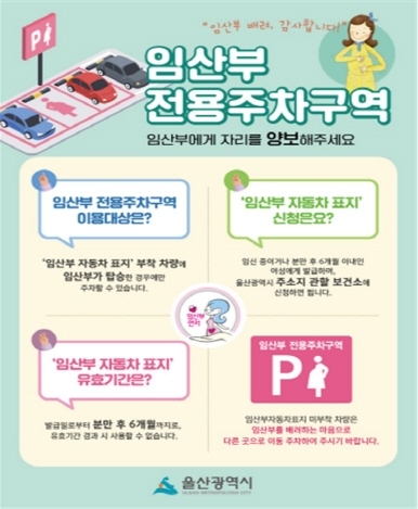 울산시가 7일 임산부에 대한 배려와 ‘아이 낳고 키우기 좋은 환경 조성’을 위해 임산부 전용주차구역 일제점검 및 홍보에 나선다.