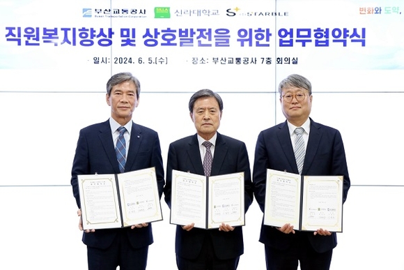 부산교통공사가 지난 5일 신라대학교, 스타블과 함께 가족친화경영 및 지역상생발전을 위한 업무협약식을 개최하고 민관학 협력 네트워크 강화에 나섰다.