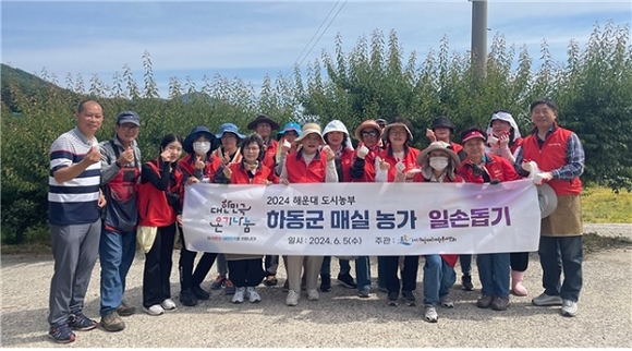 경남 하동군은 해운대구의 자매결연도시로 이날 자원봉사자들은 농번기를 맞아 매실 수확을 도우며 농가의 부족한 일손을 보태는 데 힘썼다.