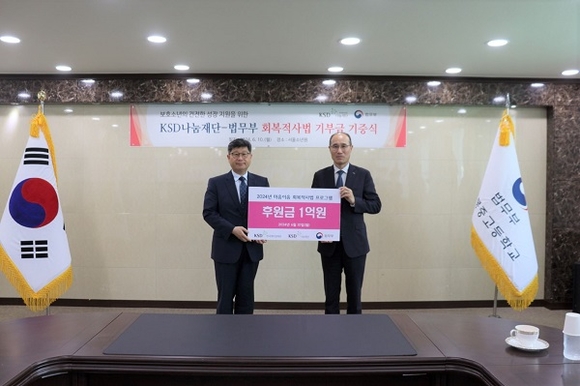 한국예탁결제원 KSD나눔재단이 지난 10일 서울소년원에서 보호소년의 재범 예방을 위한 법무부의 ‘마음이음 회복적사법 프로그램’에 총 1억원의 후원금을 전달했다고 밝혔다.
