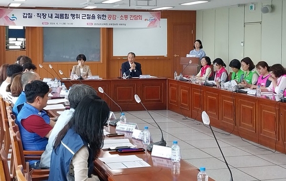 경남도교육청은 지난 11일 교육정보원에서 갑질(직장 내 괴롭힘) 행위를 근절하기 위한 개선 대책을 공유하고 '갑질(직장 내 괴롭힘) 행위 대응 안내서'를 제작하기 위한 의견을 청취하기 위해 직종별 노동조합과 간담회를 열었다.