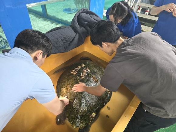 구조된 거북은 발견 당시 기력이 거의 없고 등껍질에는 따개비를 포함한 부착성 생물이 붙어 있었으며, 등갑의 일부가 패인 상태였다. 이에 현장 구조팀은 즉시 방류가 어렵다고 판단했으며, 치료와 재활을 위해 해양동물 전문구조·치료기관인 SEA LIFE 부산 아쿠아리움으로 이송했다.
