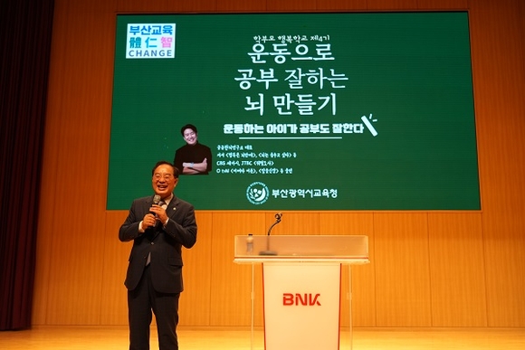 하윤수 교육감은 14일 오전 10시 BNK 부산은행 본점 대강당을 직접 찾아 학부모들과 소통하고 공감하는 시간을 가졌다. 강의는 장동선 궁금한뇌연구소 대표가 ‘운동으로 공부 잘하는 뇌 만들기(운동하는 아이가 공부도 잘한다)’를 주제로 진행했다. 장 대표는 뇌과학자의 관점에서 운동과 공부의 상관관계 및 운동의 중요성을 학부모들에게 설명했다.