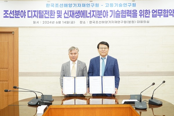 한국조선해양기자재연구원(KOMERI)이 혁신기술과 실용적 가치로 미래산업을 주도하는 고등기술연구원(IAE)과 조선 분야 디지털전환 및 신재생에너지 분야 기술 협력을 위한 업무협약을 14일 체결했다고 밝혔다.