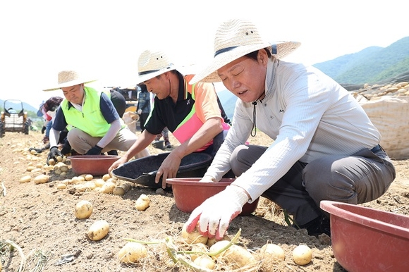 박 도지사와 일손돕기 참여자들은 감자수확기로 굴착 해놓은 감자를 수확용 상자에 모으는 작업에 손을 보태며 구슬땀을 흘렸다.