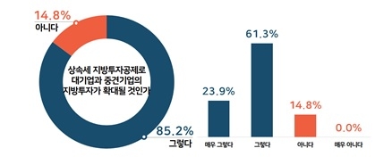 조사에서 응답 기업인들의 85.2%가 상속세 지방투자공제가 대기업과 중견기업의 지방투자로 이어질 것으로 보았고, 95.7%는 가업승계 활성화에 도움이 될 것이라고 답했다.