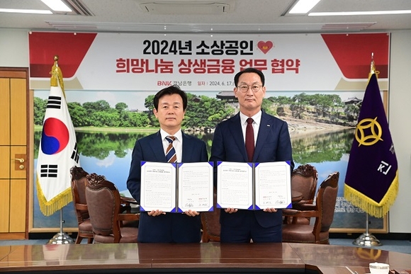 경남 진주시는 17일 시청 기업인의 방에서 BNK경남은행과 '소상공인 희망나눔 상생금융 업무 협약'을 체결했다.