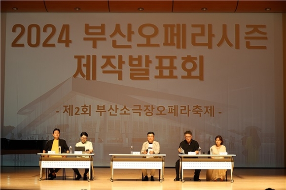 부산시가 18일 부산문화회관 중극장에서 '2024 부산오페라시즌(Busan Opera Season)' 제작발표회를 개최했다고 밝혔다. 이날 제작발표회에는 김혁주 시 문화시설개관준비과장, 차재근 부산문화회관 대표이사, 김천일 금정문화회관장, 장진규 부산광역시오페라단연합회장 등 오페라 시즌 참여 기관장, 연출가, 관계자 등이 참석해 오페라 시즌 공연작 소개와 작품의 주요 곡을 선보였다.
