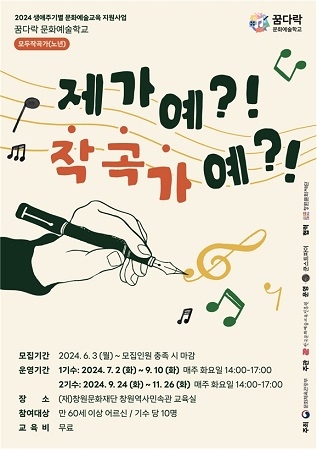 '모두작곡가_제가예?! 작곡가예?!'는 60세 이상 누구나 신청 가능하며 오는 7월 3일부터 11월 26일까지 매주 화요일 오후 2시부터 5시까지 창원역사민속관 교육관에서 10회차, 2기수로 진행된다.