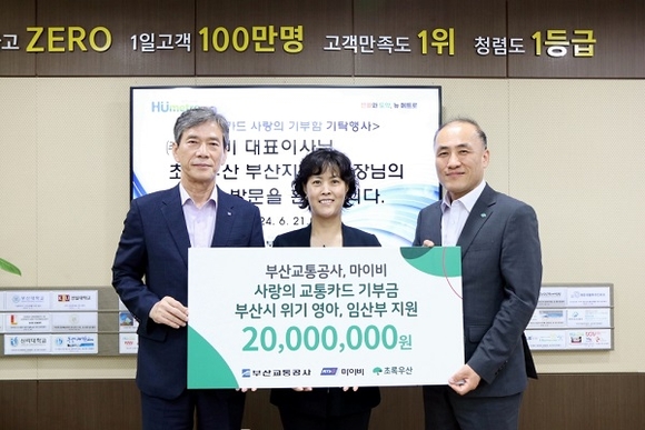 부산교통공사가 마이비와 공동으로 도시철도 전 역사에 설치한 교통카드 기부함의 성금 2000만 원을 초록우산 어린이재단 부산지역본부에 저출생 극복을 위한 지원기금으로 전달했다고 24일 밝혔다.
