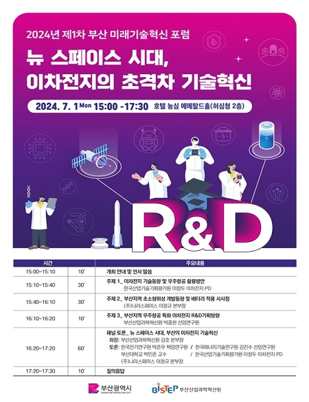 ‘부산 미래기술혁신 포럼’은 부산의 미래유망기술과 첨단전략산업 육성을 위해 중장기적 연구개발(R&D)기획 방향성을 도출해 네트워크를 확대하고자 올해부터 연간 3회 이상 개최할 예정이다. 첫 번째 포럼은 ‘뉴 스페이스 시대, 이차전지의 초격차 기술혁신’을 주제로 부산·울산·경남 이차전지, 우주항공 분야 전문가 등을 대상으로 주제 발표와 패널 토론으로 진행된다.