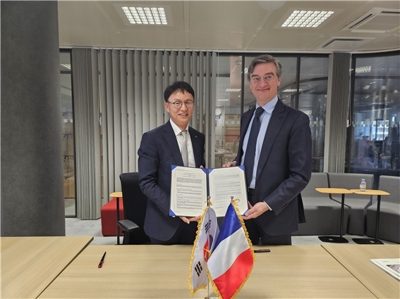 24일 DIE 본사에서 개최한 '국유재산 관리·개발 업무 협력 등을 위한 업무협약' 체결식에서 김서중 캠코 부사장(왼쪽)과 알랭 레스플랑디 베르나르 DIE 대표가 기념촬영을 하고 있다.(사진=캠코 제공)