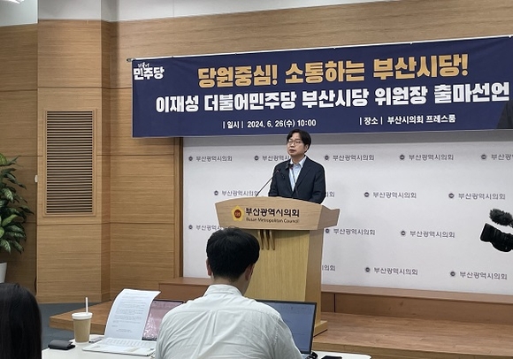 이재성 위원장은 26일 부산시의회 브리핑룸에서 기자회견을 열고 "이재명과 함께 승리하는 부산 민주당을 만들겠다"고 밝혔다.