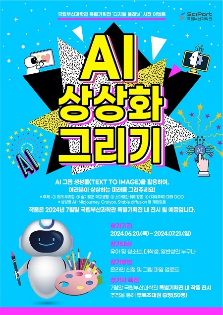 ‘AI 상상화 그리기’는 미드저니(Midjourney), 크레용(Craiyon) 등 다양한 AI 그림 생성툴을 활용해 그림을 그려보는 이벤트로 미래 우리집, 슬기로운 학교 생활, 스마트한 취미활동, 미래에 대한 자유주제 중 하나를 선택해 작품을 만들어 제출하면 된다. 참여기간은 6월 20일부터 7월 21일까지 한 달간 진행되며 어린이, 청소년, 일반 시민 등 누구나 참여 가능하다. 참가자에게는 특별기획전 내 작품 전시 기회와 추첨을 통해 무료초대권 증정 특전이 주어진다.