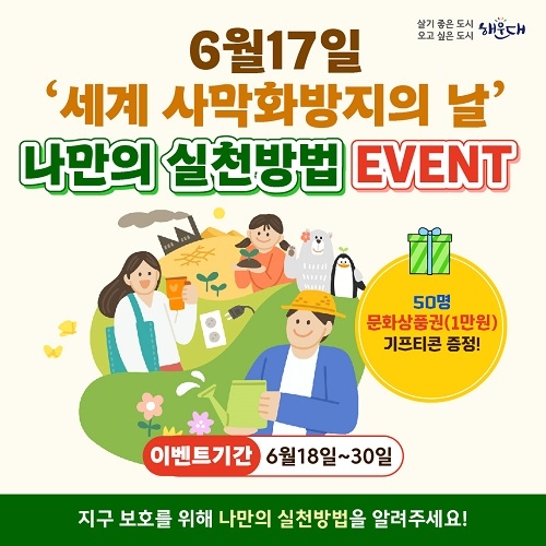 부산 해운대구가 6월 17일 ‘세계 사막화 방지의 날’을 기념해 지구 보호를 위한 나만의 실천방법 SNS인증 이벤트를 실시한다고 밝혔다.
