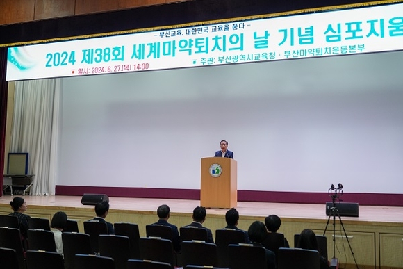 하윤수 부산시교육감이 27일 교육연구정보원 대강당에서 열린 '일상으로 파고드는 청소년 마약, 그 예방대책은 없는가?'라는 주제의 ‘학부모 대상 청소년 마약류 예방 심포지엄’에 참석해, 학부모들에게 청소년 마약류 예방 및 관리에 대한 당부와 협조를 요청했다.