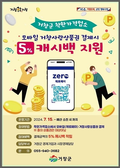 경남 거창군이 지역경제 활성화와 물가안정 모범업소 지원을 위해 오는 15일부터 착한가격업소에서 모바일 거창사랑상품권(제로페이)으로 결제 시, 결제금액의 5%를 캐시백으로 적립해 주는 사업을 시행한다.