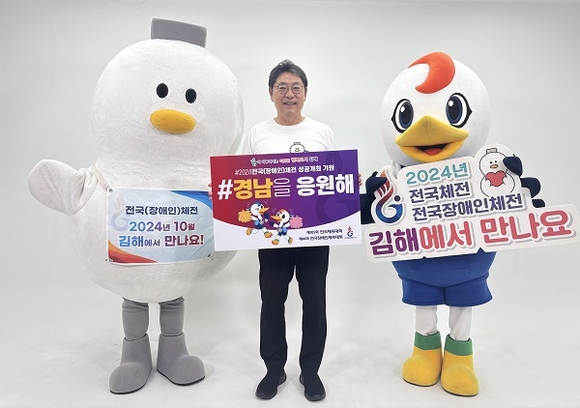 홍태용 김해시장은 3일 '#2024전국(장애인)체전 성공 개최 기원 #경남을 응원해'라는 문구의 피켓을 든 사진을 SNS에 게재하면서 챌린지 첫 주자로 나섰다.