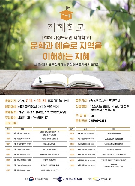 부산 기장군이 7월부터 오는 10월까지 기장도서관에서 인문 심화 프로그램인 ‘지혜학교’를 운영한다고 밝혔다.