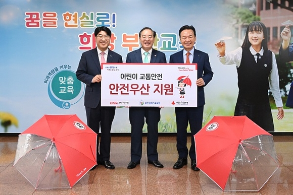 BNK부산은행이 지난 5일 부산시교육청에서 비오는 등·하굣길 어린이 교통안전을 위한 ‘안전우산’ 지원 전달식을 가졌다고 8일 밝혔다.