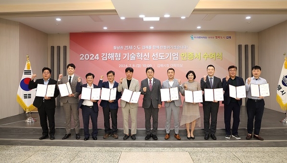 시는 이날 시청 대회의실에서 2024년 김해형 기술혁신 선도기업으로 선정된 10개사에게 인증서를 수여했다.