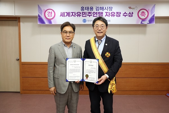 홍태용 김해시장이 9일 자유민주주의 가치 수호와 시민 행복 및 복리 증진에 헌신한 공로로 세계자유민주연맹(WLFD)에서 수여하는 '자유장'을 수상했다.
